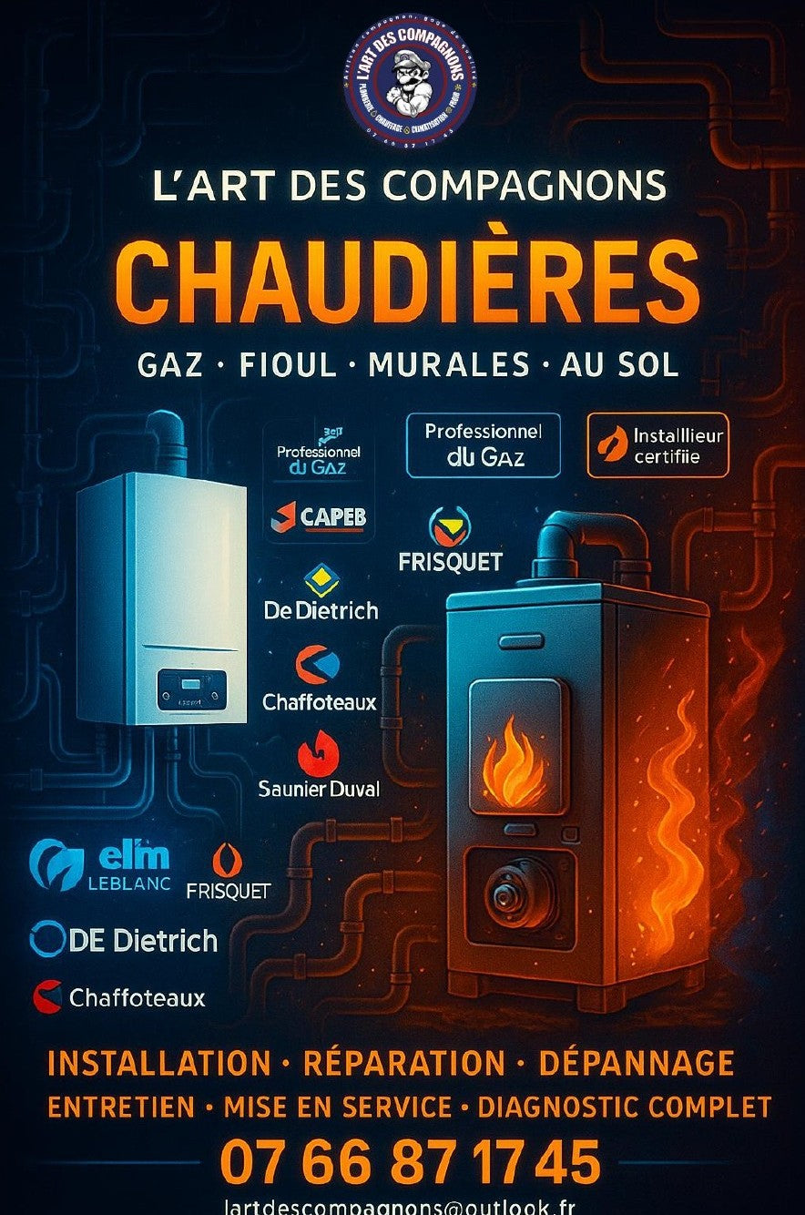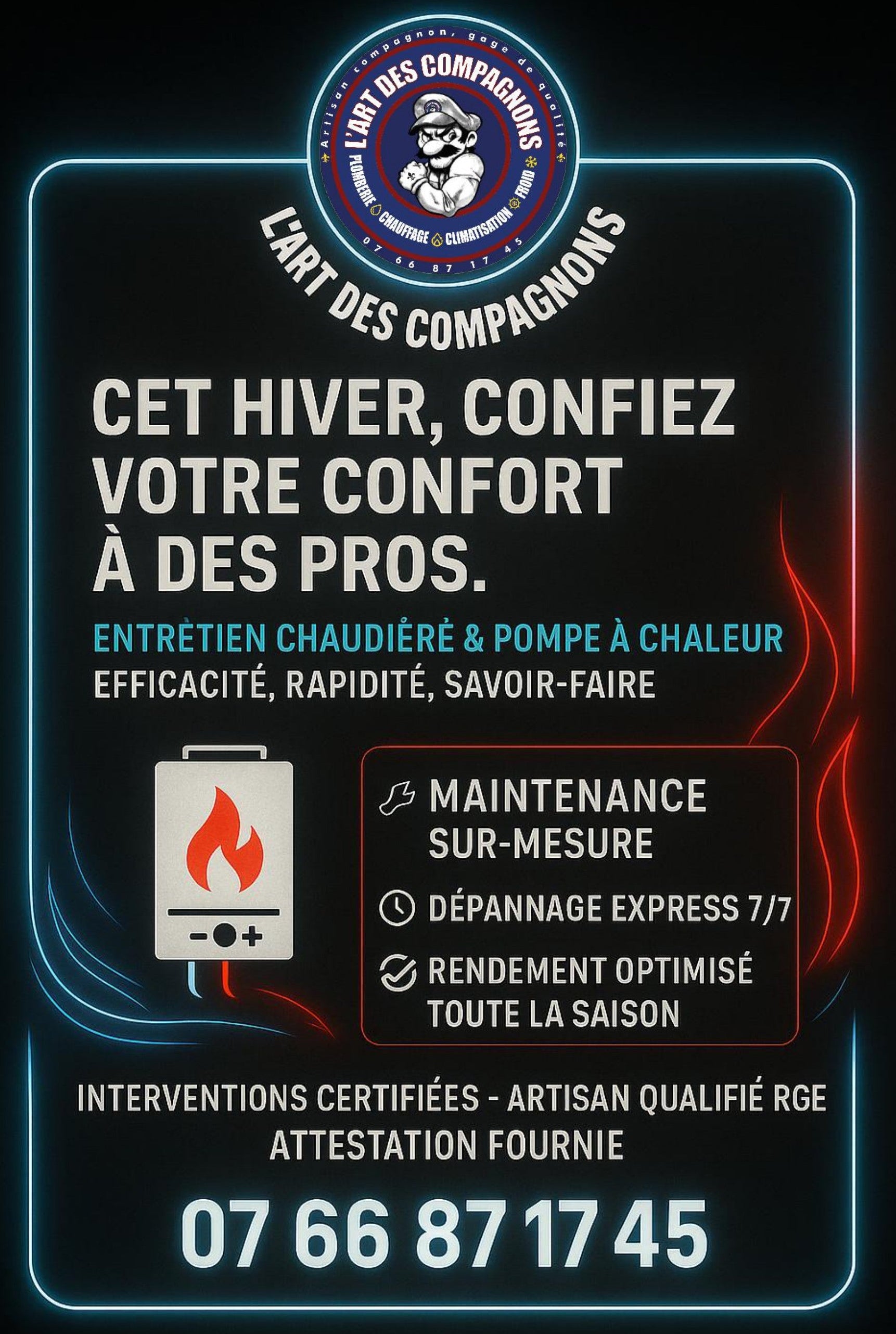 Bienvenue chez L'Art des Compagnons : Nous réparons avec passion, vous économisez avec raison! Nous sommes spécialisés dans la maintenance, le dépannage et la réparation de vos systèmes de chauffage, de climatisation, de pompes à chaleur, de plomberie, ainsi que dans le froid commercial et les machines à glace à écaille des marques Maja et Geneglace. Notre engagement est de proposer des solutions qui allient respect de l'environnement, haute performance énergétique et économies substantielles pour nos clients, qu'ils soient professionnels ou particuliers. Formés directement par les plus grandes marques comme Daikin, Mitsubishi, Fujitsu, Atlantic, Frisquet, elm Leblanc et bien d’autres, nous avons à cœur de privilégier la réparation chaque fois que c’est possible, afin de prolonger la durée de vie de vos équipements et de limiter l’impact sur l’environnement et sur votre portefeuille. Faites confiance à notre savoir-faire et à notre passion pour un service fiable, durable et économiquement avantageux.